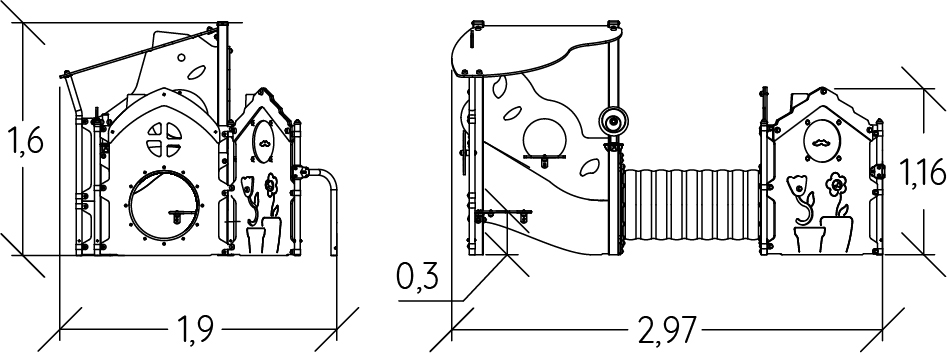 Rozmery modulu sú: 2,97 m dĺžka, šírka 1,90 m, výška 1,60 m. Výška voľného pádu (HCL) je 0,60 metrov.