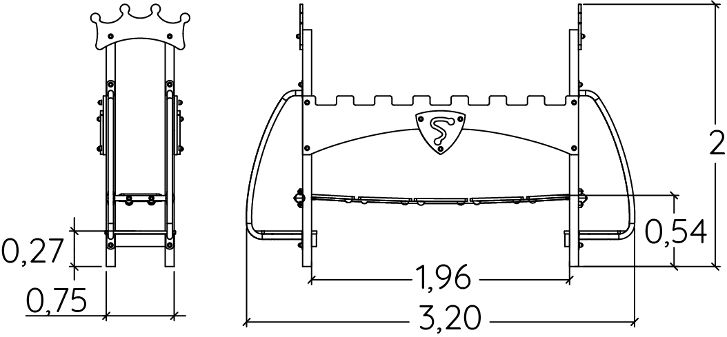Rozmery modulu sú: 3,20 m dĺžka, šírka 0,75 m, výška 2,00 m. Výška voľného pádu (HCL) je 0,60 metrov.