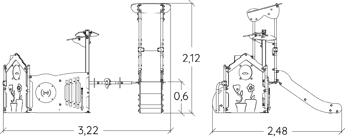 Rozmery modulu sú: 2,48 m dĺžka, šírka 3,22 m, výška 2,12 m. Výška voľného pádu (HCL) je 1,00 metrov.