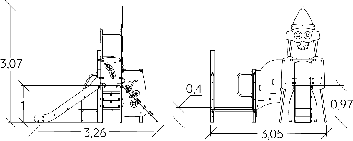 Rozmery modulu sú: 3,05 m dĺžka, šírka 3,26 m, výška 3,07 m. Výška voľného pádu (HCL) je 1,00 metrov.