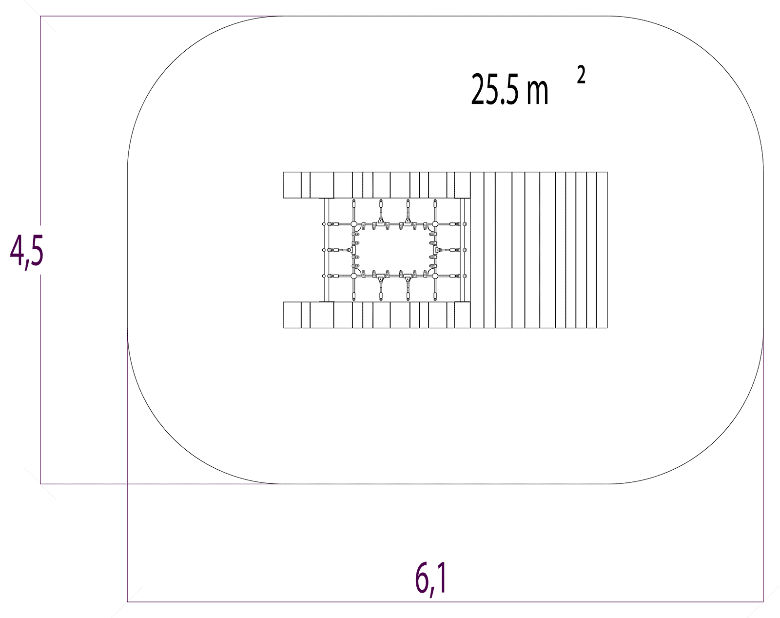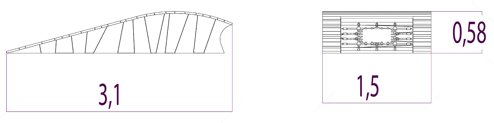 Rozmery modulu sú: 2,95 m dĺžka, šírka 1,50 m, výška 0,58 m. Výška voľného pádu (HCL) je 0,60 metrov.