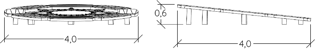 Rozmery modulu sú: 4,00 m dĺžka, šírka 4,00 m, výška 0,60 m. Výška voľného pádu (HCL) je 0,60 metrov.