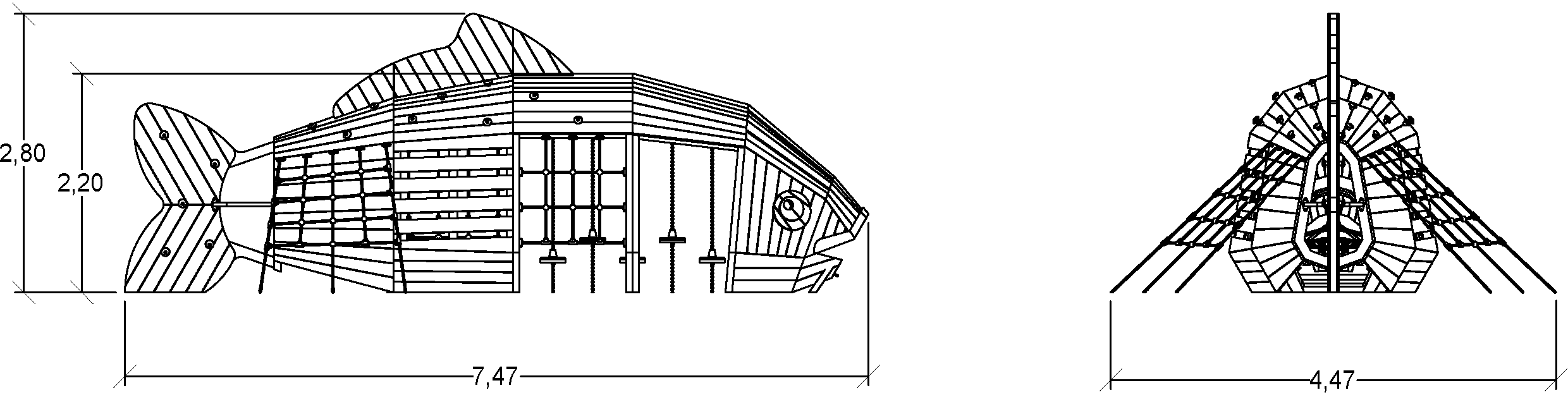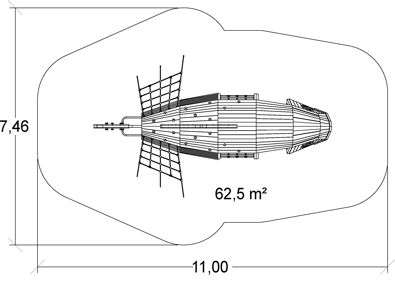 Rozmery modulu sú: 7,47 m dĺžka, šírka 4,47 m, výška 2,80 m. Výška voľného pádu (HCL) je 2,20 metrov.