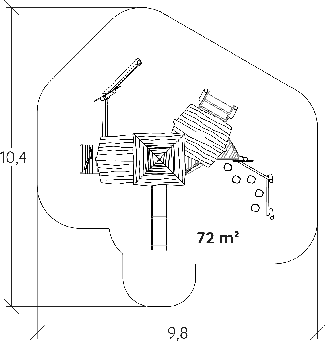 Rozmery modulu sú: 6,70 m dĺžka, šírka 6,70 m, výška 4,80 m. Výška voľného pádu (HCL) je 1,37 metrov.