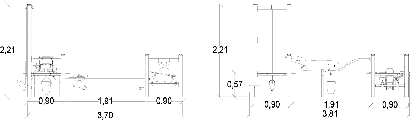 Rozmery modulu sú: 3,95 m dĺžka, šírka 3,80 m, výška 2,20 m. Výška voľného pádu (HCL) je 0,60 metrov.