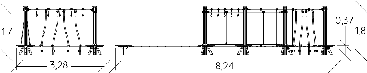 Rozmery modulu sú: 8,24 m dĺžka, šírka 3,28 m, výška 1,80 m. Výška voľného pádu (HCL) je 0,60 metrov.